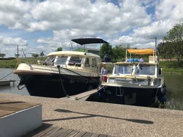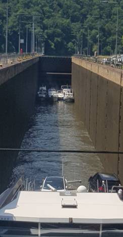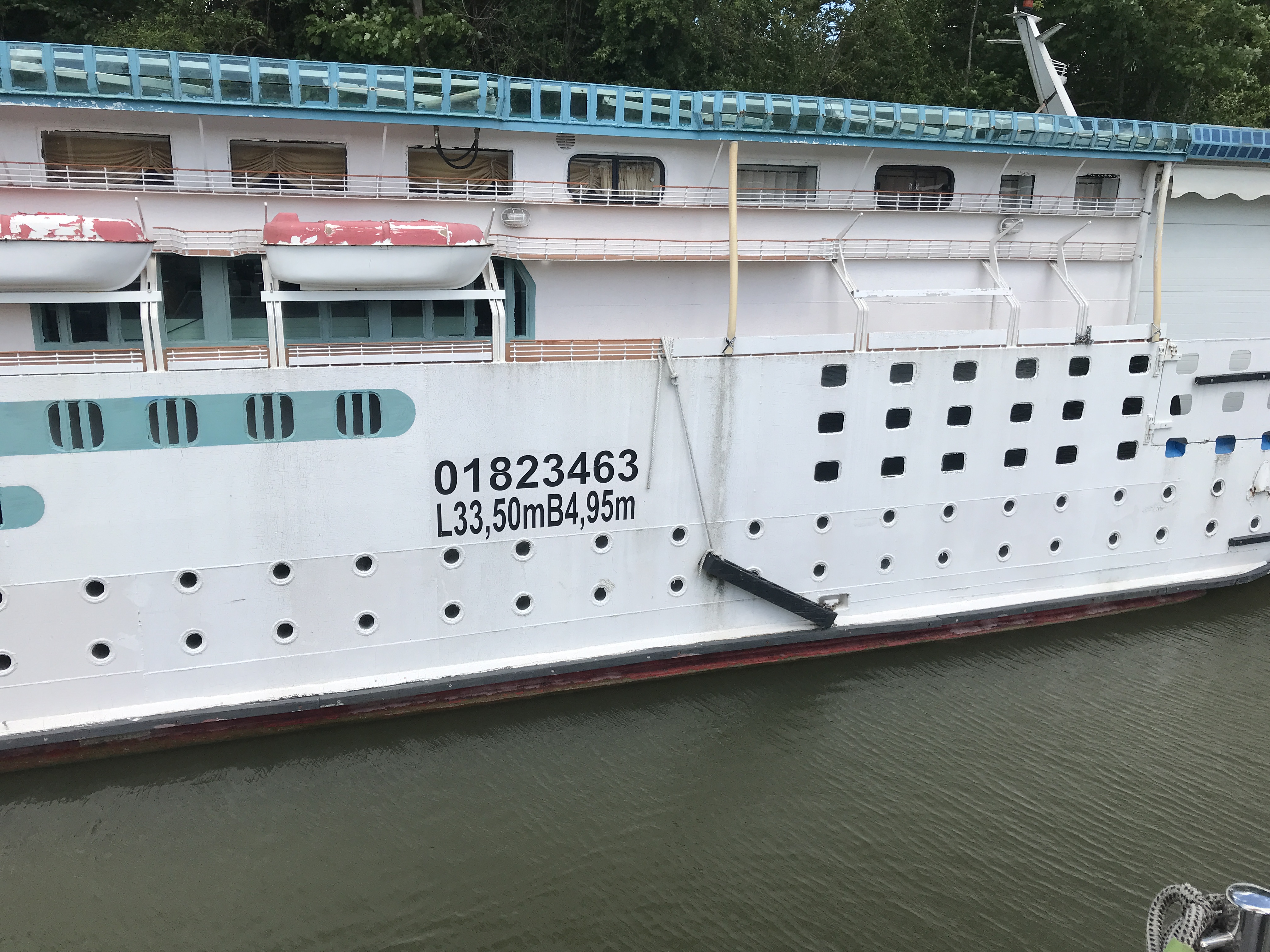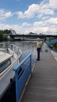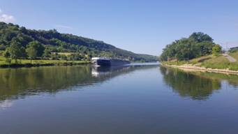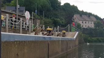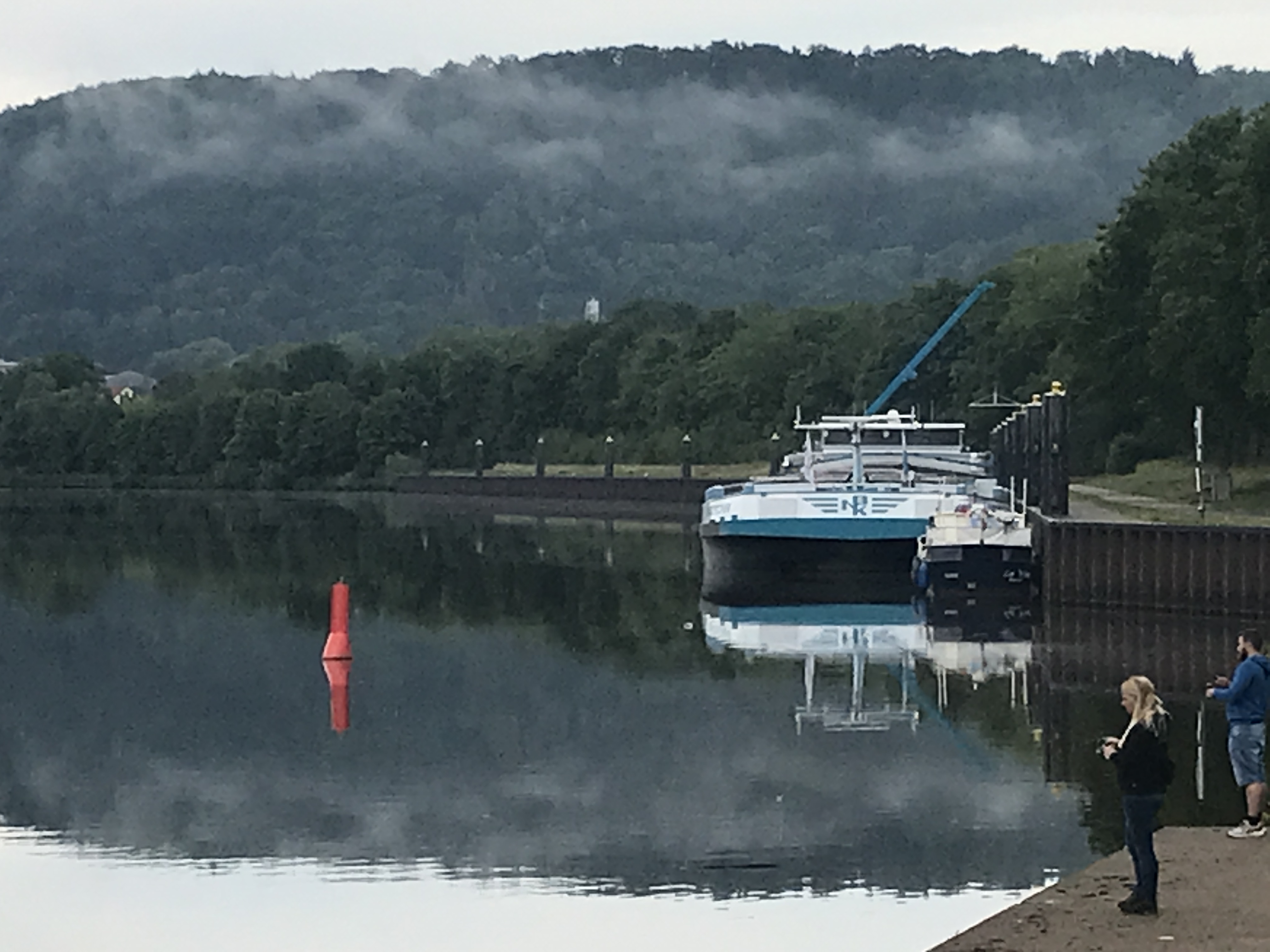 Merzig legen wir vor einem Frachter an der Spundwand im Fluss an, da uns der