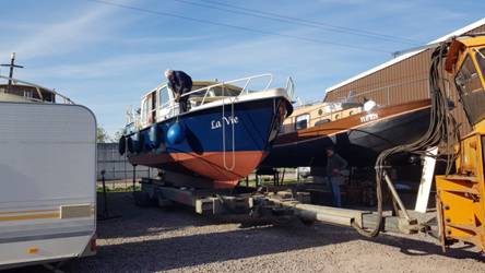 Wohnwagen (unsere Baubaracke) in die Heimat. Zurück auf dem Wasser schwimmt